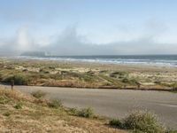 An elevated road along the California coast, surrounded by grey skies and gloomy fog. The clear sky above contrasts with the gloom of the natural environment. Waves crash against the shore, creating a picturesque coastal landscape.
