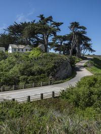 This image captures a scenic view of a long winding country road in California, USA. The road is flanked by two big trees and leads to a building perched on a hill in the distance. The lush green landscape, with mountains and grassy hills, creates a beautiful natural environment. The clear sky and coastal waters in the background add to the tranquil atmosphere. This photo showcases the unique architecture and infrastructure of the rural areas in California, inviting viewers to explore the beauty of this coastal region.