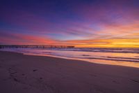 This image captures the beautiful coastal landscape of Los Angeles, California, USA at dawn. The photo shows an open space of sandy beach stretching alongside the calm waters of the ocean. The sky is adorned with a mix of clouds and the horizon meets the sea in the distance. As the sun rises, the afterglow bathes the surface of the water in warm hues, casting a serene ambiance. In the sky, contrails of passing planes can be seen. This photo perfectly depicts the tranquility and natural beauty of a Los Angeles beach at the break of day.