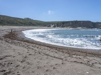 This is an image of a coastal bluff in California, USA. The clear sky highlights the natural beauty of the open space. The foreground features sand, water, and waves crashing against the shore. In the distance, you can see the ocean and the cliffs along the coastline. This photo captures the serene and picturesque natural environment of California's coastal region.