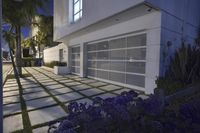 Modern residential property in California, featuring a sleek facade with large windows and a concrete walkway. The night sky illuminates the palm trees and blue and white flowers in the courtyard. A perfect suburban home.