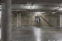 A view of an underground parking lot in Los Angeles, California. The concrete surface of the parking deck reflects the artificial light, giving the space a bright and open feel. The walls and floor are made of cement, adding to the architectural appeal of the building.
