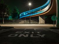 the curved bridge is lit up blue with green light on it's sides and is over a road in front of a concrete wall