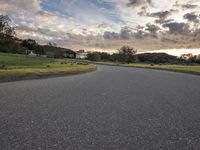 This image captures the beauty of a California suburban landscape at dawn. The modern architecture of the residential houses is surrounded by lush green grass and tall trees. The straight road curves gently through the rural scenery, showcasing the well-maintained infrastructure. The road surface, made of smooth tar, complements the low clouds in the sky. This picture epitomizes the tranquility and serenity of suburban living in California.