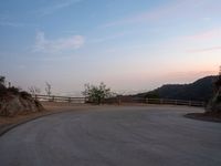 This is a scenic image of a person on a skateboard riding down a mountain road at dusk in California, USA. The landscape features a curved asphalt road surrounded by dirt and gravel. The cityscape can be seen in the distance. As dawn breaks, the sky is filled with orange hues, creating a beautiful contrast against the road. The image captures the serenity and beauty of nature, offering an overview of the picturesque view. The person on the skateboard adds a sense of adventure to the scene.