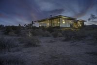 A dramatic and emotional landscape in Yucca Valley, California. The dark night sky contrasts with the artificial lights of the homes and villas. The open spaces and desert surroundings create a sense of solitude and tranquility.