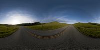the camera view shows a curved road running through green hills and grass and flowers on the side