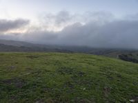 A picturesque dawn in California, with an open road winding through the scenic landscape. Majestic mountains and lush green grass surround the fog-covered hills. The clear sky breaks through the grey gloom, creating a breathtaking scene of elevated beauty.
