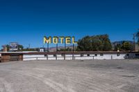 This image showcases an abandoned building in the California desert near Palm Valley. The clear sky and open space create a stark contrast to the dilapidated motel sign on top of the structure. The surrounding landscape is characterized by desert dirt and gravel roads. This photo captures the rural atmosphere of California's vast open spaces and the remnants of its once-flourishing hospitality industry.