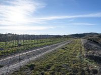 This image captures the scenic beauty of rural California in the USA. The dirt road cuts through the expansive landscape of grassy fields and rolling hills. At dawn, the sun casts a warm glow on the vegetation and trees, giving a serene and peaceful atmosphere. The clear sky with scattered clouds stretches out to the horizon, showcasing the untouched wilderness. In the distance, the agricultural fields, vineyards, and plantations create a harmonious blend of natural and cultivated environments. This photo represents the charm and tranquility of California's rural countryside.