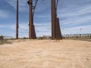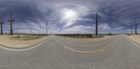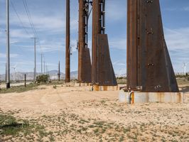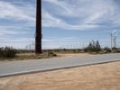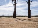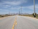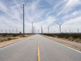 Mojave Desert landscape in California features industrial elements like electric mills and windmills under clear skies. Dirt and gravel surfaces define the open space, while the asphalt road stretches straight through the scenic setting.