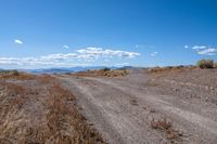 A low-angle view of a rugged mountain landscape in California, USA. The dirt road cuts through the desert terrain, surrounded by grass and trees. Clear sky above adds to the natural beauty.