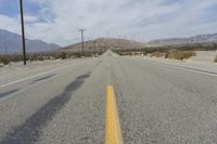 This is an aerial view of a straight road in the California desert, USA. The asphalt road cuts through the rugged mountain landscape, surrounded by vast stretches of nature. On one side, there is a rural area with factories and industrial buildings. On the other side, tall windmills stand against the clear blue sky, harnessing the power of the wind. The surface of the road and the surrounding area are dry and dusty, typical of the desert climate. This photo captures the blend of nature and human intervention in the California desert.