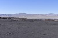 A rugged desert landscape in California's wilderness. The open space is filled with mountain landforms and rocky surfaces. Clear skies above showcase the beauty of this natural environment.