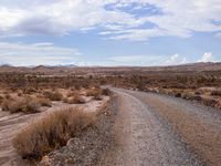 A rugged off-road track in the deserts of California. The gloomy grey sky contrasts with the low vegetation and sand-covered landscape. The straight road surface leads towards the mountains in the distance.