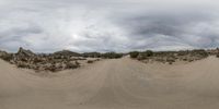 a dirt road going across desert with clouds in the distance of the image behind it