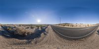 a wide angle view of a deserted road surrounded by trees and shrubbery in the desert