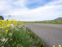 A gloomy day in rural California, with a grey sky casting a gloom over the yellow and green fields. The asphalt road cuts through the lush vegetation and grassy prairies, showcasing the natural beauty of the state.