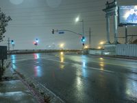 A gloomy evening in Los Angeles. Wet asphalt reflects the city lights and traffic signals, creating an eerie urban vibe. The grey sky adds to the dark and mysterious atmosphere of the city at midnight.