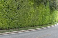 A scenic road in Los Angeles, California, surrounded by lush vegetation. The tree-lined asphalt road leads to a green landscape with hedges and shrubs. A perfect representation of the beauty of Los Angeles.
