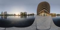 A cityscape in Los Angeles, California at dawn. The skyline is dominated by high-rise buildings and corporate headquarters. The clear sky reflects off the water, creating a stunning reflection. The urban design features art and architecture buildings along a river, creating a picturesque scene.