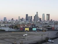 This is an image of the downtown skyline of Los Angeles, California, in the USA. The cityscape features high-rise buildings and skyscrapers, creating a stunning urban metropolis. The photo captures the city at dawn, with the sky illuminated in hues of pink and orange. The bustling metropolitan area showcases a busy transportation network. This image represents the vibrant energy and architectural beauty of Los Angeles, making it a perfect depiction of the city's unique charm.