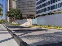 A bustling day in the heart of Los Angeles' business district. Office buildings and high-rises line the streets. Modern architecture contrasts with the clear sky. People walk along the urban sidewalks, embracing the city's unique urban design.