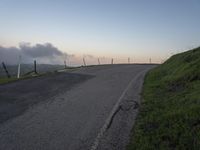 A scenic morning drive along a winding road in California's highlands. The lush green landscape contrasts with the asphalt road surface, creating a picturesque view. Clouds on the horizon highlight the elevated nature of the area.