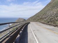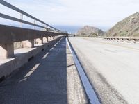 A road along the coastal landscape of Big Sur, California. The grey sky creates a dramatic backdrop. The road surface, bridge, and guard rail provide infrastructure for the scenic drive. A quintessential day on the iconic Pacific Coast Highway.