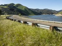 Scenic view of a coastal highway in California, with lush green hills and a large body of water in the background. The clear sky accents the natural beauty of the landscape. A perfect day for a road trip.