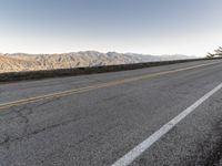 A scenic road trip view of a California highway at dawn with stunning mountains in the background. The road surface is smooth asphalt with clear sky overhead. In the foreground, there is a lone dog laying on the sidewalk. The landscape offers a rugged and picturesque overlook of nature. The infrastructure includes an Armco barrier along the side of the road, ensuring safety for drivers. This image showcases the beauty of the California landscape and invites adventure on the open road.