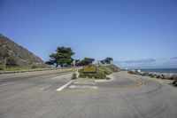 A scenic view of the Pacific Coast Highway in California, with the ocean and coastline in the background. Empty road bordered by grassy hills and trees. Clear skies and an Armco barrier ensure a safe and enjoyable drive.