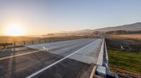 An elevated concrete highway in California, with the sun shining down on a clear sky. The road curves along the coastal landscape, surrounded by hills and a fenced field. A picturesque dawn scene.