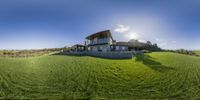 A modern residential home in Los Angeles, California. The house is perched on a grassy hill, offering stunning views of the surrounding landscape. The clear sky and sunlight create a beautiful ambiance. An ideal vacation spot.