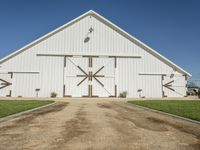 This is a photo of a rural property in California, USA. The image shows an architecture with a straight road leading to the house. The clear sky above contrasts with the facade of the building, showing the roof, siding, and shed. The property is surrounded by grass, dirt, and gravel surfaces. This photo represents a sunny day in the countryside, capturing the essence of the rural lifestyle and agricultural activities. It is the perfect depiction of rural real estate in California.