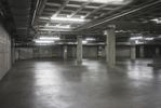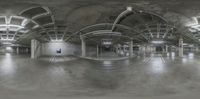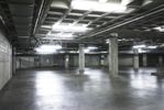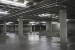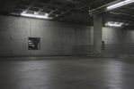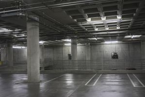 An underground parking garage in Los Angeles, California. The industrial architecture features concrete walls and metal columns. The gray and black color scheme adds to the atmosphere. Stairs lead to the open space above ground.