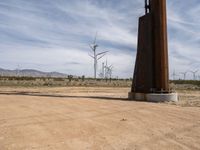Industrial landscape in California's Mojave Desert. Clear skies over a mix of dirt surfaces, gravel areas, and construction sites. Windmills and factories define the Los Angeles open space against mountain backdrops.