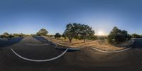 a photo taken from the bottom half of a large camera lens showing an intersection with trees, shrubs and a road