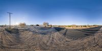 a fish eye view of a person riding a motorcycle on a dirt road near trees