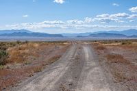 This is an image of a road in California, USA, surrounded by a rugged landscape. The vegetation on both sides of the road creates a plant community that thrives in the desert environment. The road surface is a combination of asphalt, dirt, and gravel, indicating that it can be used for both on-road and off-road adventures. In the distance, the clear sky and clouds contrast with the mountainous terrain. This photo captures the natural beauty and diversity of California's highland plains. It is a perfect representation of a sunny day in the California desert.