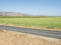 This is an image of a rural landscape in California, USA. The photo shows a road made of asphalt cutting through a vast plain covered in grass. It is a bright day with clear skies, highlighting the natural environment of the area. The grass surface extends as far as the eye can see, reflecting the agricultural land lot that surrounds the road. This image captures the beauty of the California countryside, with its expansive fields and scenic prairies.