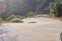 A stunning California landscape captured at dawn. The sun is setting behind a hill, casting a warm glow on the asphalt road. In the distance, a majestic mountain rises against the clear blue sky. A large rock face adds to the natural beauty of the scene. This picturesque road features a high curve and an S-curve, giving it an elevated and adventurous feel. Perfect for showcasing the beauty of nature and the allure of the California landscape.