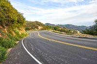 This is an image of a serene mountain landscape in California, USA. The photo was taken at dawn, with the sun casting a warm golden glow on the landscape. A road, made of smooth asphalt, winds through the mountains, creating a beautiful S-curve. The clear blue sky is decorated with fluffy clouds and contrails. This photo showcases the breathtaking natural beauty of California and the contrast between the rugged mountains and the smooth road. It captures the essence of a peaceful day in nature.