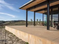 A modern residential building in California, surrounded by a picturesque landscape. The open space and nature provide a peaceful ambiance. The house features a spacious porch and deck, perfect for enjoying the clear skies and beautiful views.