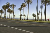 A man rides a skateboard on a coastal road in Los Angeles, California. Tall palm trees line the path, creating a scenic landscape against the clear sky. The ocean waves crash on the sandy shore, providing a peaceful and recreational atmosphere.