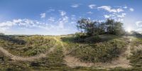 A panoramic view of a wide landscape in California, showcasing the natural beauty of the highlands. The modern architecture of residential villas blends seamlessly with the rugged wilderness. Clear skies and clouds above highlight the elevated path through the picturesque scenery.