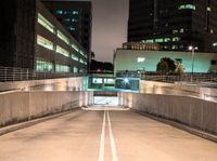 This is an image of a high-rise building with modern architecture in the business district of Long Beach, California. The concrete street is illuminated by street lights, providing artificial light in the dark night. The road surface, made of asphalt, stretches straight towards the entryway of the building. The city's urban design is reflected in the high-rise office building and the elevated road. The gloomy grey sky contrasts with the city lights, creating a moody atmosphere. This photo captures the essence of city life in Long Beach, California.