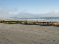 This image captures the gloomy and grey ambiance of a coastal city in California, USA. The picture shows an asphalt road winding along the low-lying shoreline, with the fog hovering above the ocean. In the distance, the clear sky contrasts with the gloomy grey clouds. Along the road, there are Armco barriers and trees, providing a sense of natural environment. This photo encapsulates the feeling of a road trip to the beach, where vacationers can enjoy the sand, water, and waves crashing against the shore.