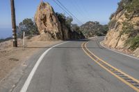 A scenic drive through the Malibu Mountains in California, USA. The road winds through the beautiful landscape, surrounded by majestic trees and towering mountains. Clear blue skies highlight the natural beauty of this straight and curved asphalt thoroughfare.