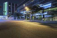 A nighttime view of the modern architecture in Los Angeles. The cityscape is illuminated by neon lights, creating a vibrant and artistic atmosphere. The glass-walled office buildings and storefronts add to the metropolitan vibe of the city.